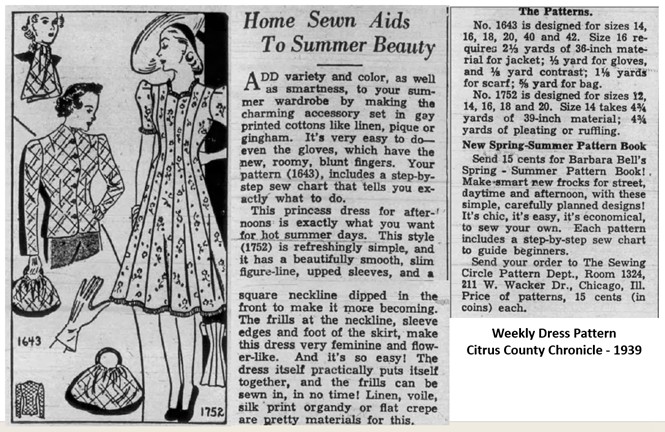 The Citrus County Chronicle started to publish advertisements for dress patterns in the early 1900’s. Drawings of the latest fashions from the “big city” were accompanied by estimates of how much material would be required to make the clothing. In many cases, the material required would be based on the size of the woman. Mary Lou Brown, the CCHS’ Archivist, recalls that she used to make some of her most fashionable dresses by using a mail-order pattern and her family’s sewing machine. She humorously notes that the sizing measurement for dresses has been adjusted downward to accommodate changing American profiles.