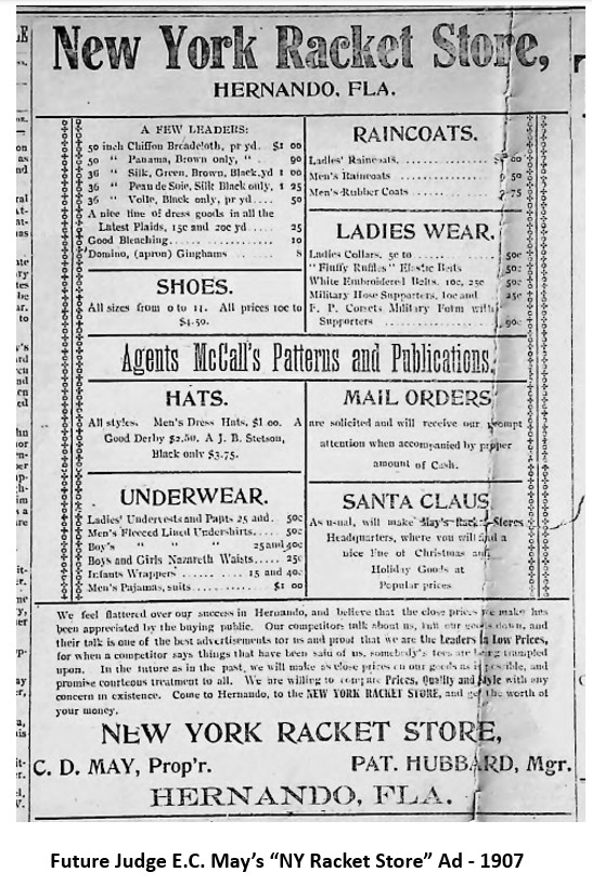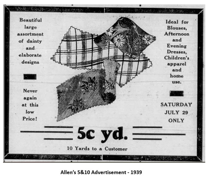 Local stores such as Otto “Pop” Allen’s 5&10 catered to the local dressmakers with an expanded inventory of assorted cloth materials, During the special “Thrift Days” sales in Inverness, Allen offered a wide variety of flat cloth, suitable for a number of different applications, for only 5 cents per yard.