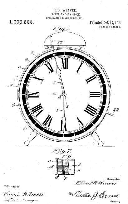 Description: This invention relates to an alarm clock that includes and electrically operated bell and lighted at the time that the bell is sounded.