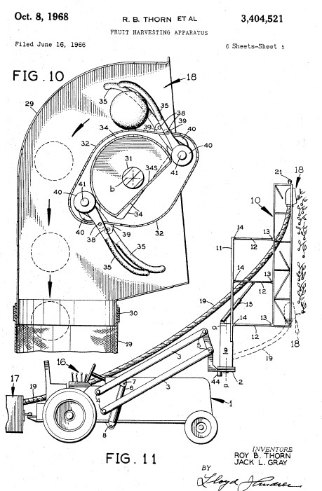 Description: Four years after patenting his mechanical fruit picker, Roy Thorn improved the process by using hydraulic rather than mechanical means. This interesting device could be set up to pick fruit on up to four trees at once. Mr. Thorn was impressive inventor who passed away in 2002 at the age of 98.