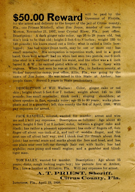 Many people have an idealized vision of what life must have been like in the 1890’s. Were ladies with parasols gliding down the streets of Floral City, Inverness and Crystal River in the “Good Old Days”? Was crime under control through the efforts of our law enforcement officers? Did judges dispense firm justice to keep the county safe?
