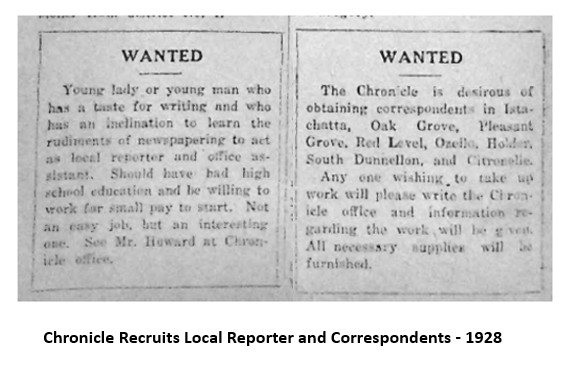 Newspapers realized that their readers were clamoring for more information about their community. By the 1920’s, the Chronicle had committed to expanding their local coverage by both hiring a staff local reporter and greater use of local stringers / correspondents.