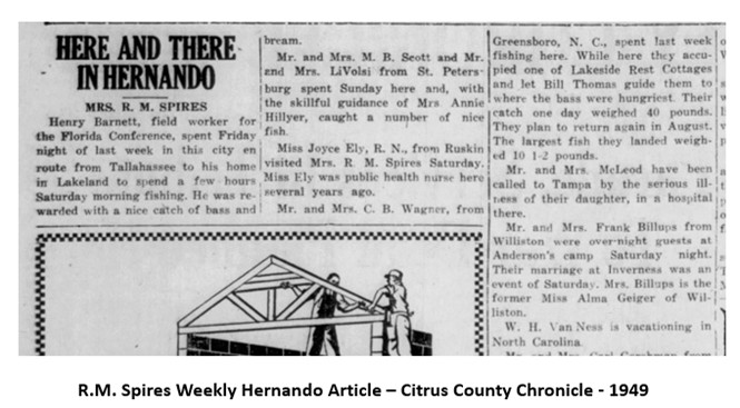 For over 40 years, Ethel Carrington Spires (aka “Mrs. R.M. Spires”) kept a watchful eye on everyday events in Hernando – and reported almost everything she saw to readers of the Citrus County Chronicle. It’s been said that nothing escaped her notice while she sat on her front porch. She was equally adept at reporting about visiting travelers, honeymooners, fishing tips, marriages and serious illnesses.