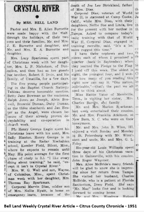 Mrs. Bell Land had served for two terms on the Crystal River City Council before becoming a correspondent in 1951. A sampling of her articles in 1951 show both local Christmas play cast updates and the usual visitor information. The Korean War involved several Crystal River young men and her column kept everyone informed regarding their status and location. She frequently included the military addresses where soldiers and sailors anxiously awaited mail containing news from the homefront.