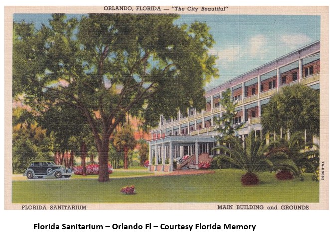 Note that she references a local patient at the “Florida Sanitarium”. At the time, some medical experts felt that tuberculosis could be cured through rest, fresh air and sunshine in a remote facility.