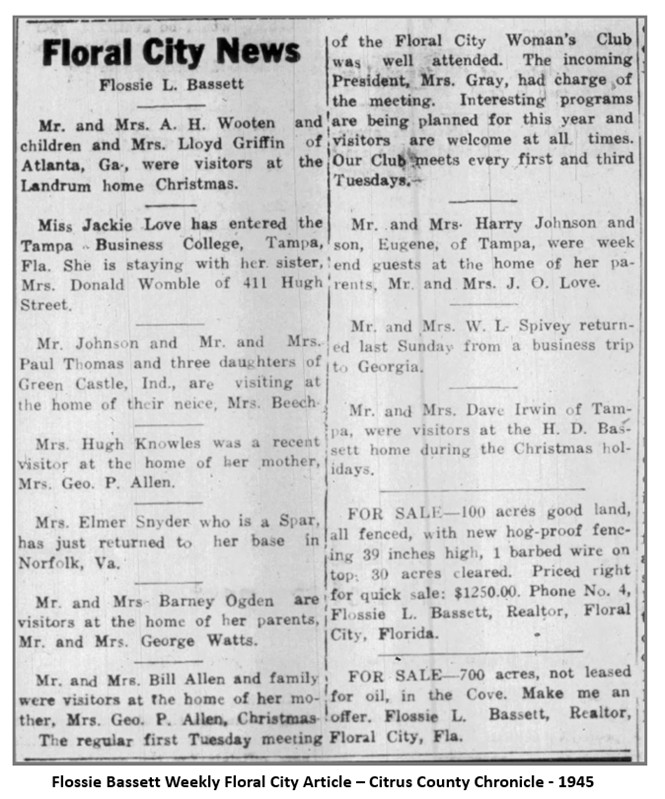 A sampling of her Floral City News update from 1945 provides some insights into the scope of Mrs. Bassett’s reporting. Since the article was written after New Year’s Day, there were stories about visitors who spent time in the town, who had returned to town and the status of some local military personnel. You’ll also note that she included some advertisements about the properties she was offering for sale. Mrs. Bassett was one of the first women to be formally certified as a real estate agent in Florida.