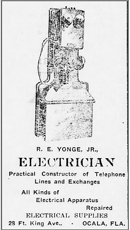 Once Bell’s patent had expired, start-up telephone companies blossomed across the country. There were few exchanges or connected networks during the early installations. Connections among customers would eventually follow, but initially private lines between customers were offered. The Ocala Telephone Company was established in 1895 and a local electrician/plumber/bicycle repairman, R.E. “Rossie” Yonge Jr., served as the Superintendent and Head Installer of the company. He set up all of the equipment and then climbed the 27-foot telephone poles (sometimes falling off the ladder) to string lines through the city. He eventually set up a switching device that provided rudimentary connection among his customers.