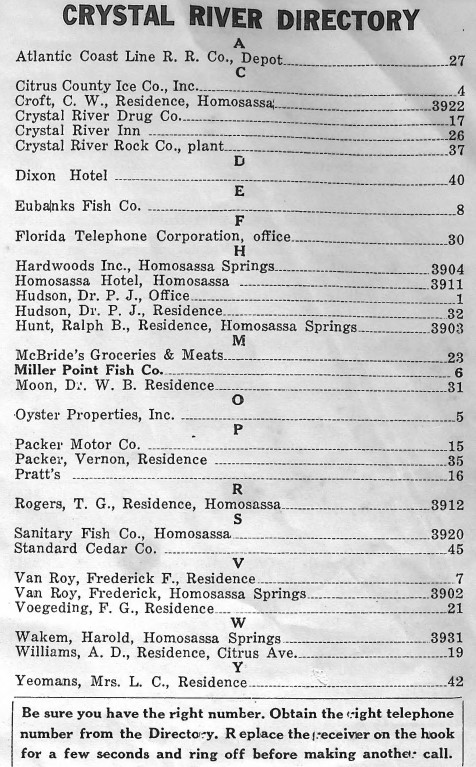 Direct dial phones were not invented until the mid-1920’s and not available in Citrus County until more than 20 years later.