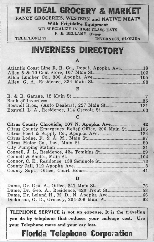 While some businesses took advantage of the new telephone, installations by Citrus County residents lagged. There were pay stations in Inverness and Crystal River for the people who only needed to make an occasional phone call. Neighbors who had residential phones would help others in times of need. Prices were perceived to be too high for common people at that time. The Florida Telephone Corporation directory for 1935 shows only about 60 phones in operation in Inverness and 30 installations in Crystal River.