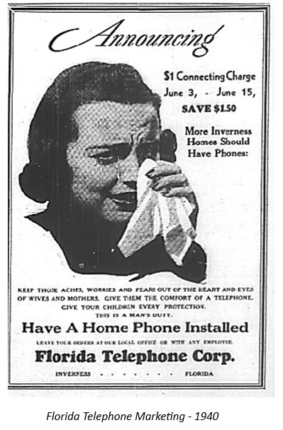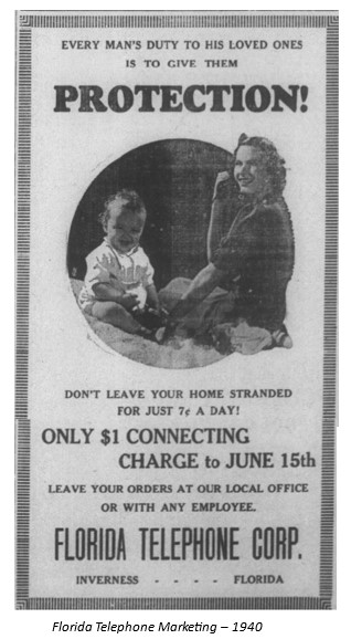 Florida Telephone decided to embark on a bold marketing strategy 1940. They would embarrass any man who did not “do his duty” to protect his wife and family by having a telephone at home. The local Inverness telephone exchange ran advertisements in the Citrus Chronicle showing a crying wife who was scared apparently because she didn’t have a home telephone. Another ad proclaimed “Every man’s duty to his loved ones is to give them protection” featuring a contented baby and wife (now smiling because she has a phone). The company offered a limited-time connection discount and a low charge of just 7 cents per day. The campaign must have been successful because Inverness residents soon reported that the equipment that Florida Power allocated to Inverness could not keep up with customer usage.