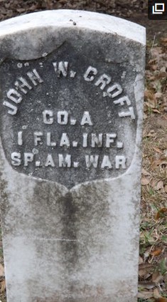 Private John W. Croft (Hernando). Mustered in May 20th, 1898; Mustered out in December. During his enlistment, he was confined to quarters two times due to illness. He was a member of the pioneer Croft family of Hernando FL. He died in 1927 after spending time in a home for disabled volunteer soldiers.