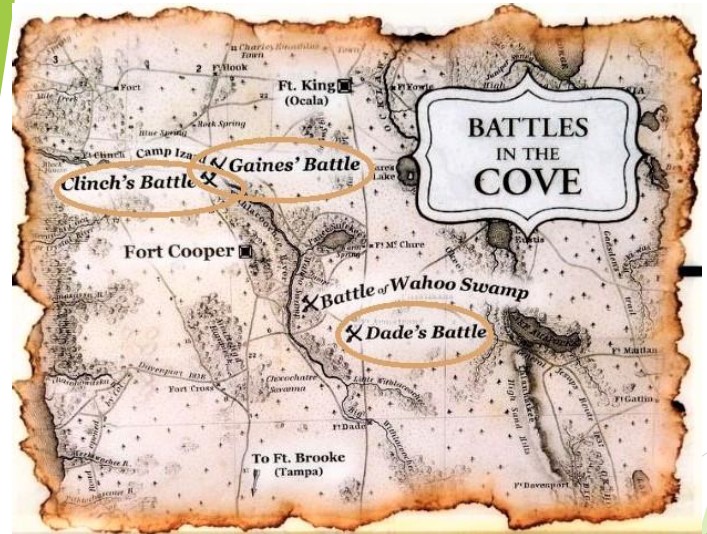 Gaines named his makeshift fort “Camp Izard” in honor of the fallen hero. His troops dug in and prepared for a siege by Osceola and his bands. Neither side could dislodge the other from their positions. Gaines troops were cut off from supply routes and provisions ran dangerously low. They began to butcher their horses and pack animals to stay alive. In the meanwhile, Osceola had scouts embedded throughout the swamps and surrounding forests. They reported to their chief that a large contingent of soldiers under General Clinch were enroute to relieve Gaines’ men. The immanent arrival of the soldiers caused Osceola to reconsider his siege of Camp Izard and sign a truce which allowed the soldiers to finally leave their fortification.