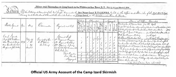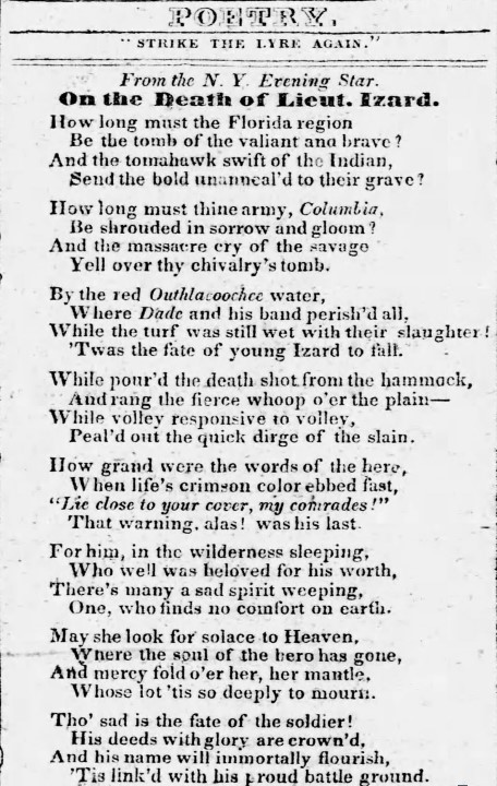 General Gaines marched from Fort Brooke (Tampa) in search of the opposing Seminoles. He had expected to find more rations to replenish his supply at Fort King (Ocala) but was disappointed to find that General Winfield Scott told Gaines there were insufficient provisions there. He decided to march back to Fort Brooke, but the path would require fording the Withlacoochee River near a Seminole stronghold. He underestimated the opponent’s strength and thought that crossing the river would be uneventful. On February 28, 1836 Lt. Izard volunteered to serve as a ranger and find the best place to ford the river. He dismounted from his horse on the east bank of the river and attempted to find a path to the western shore. A Seminole scout spied Izard preparing the cross and took aim at the Cavalryman. A musket ball had pierced Izard’s eye. He continued to lead his men and told them “to keep their positions and lie close”. However, the futility of their situation became clear. His troops managed to drag him back to a rudimentary fort that they had constructed. Izard received as much medical treatment as could be offered in that location. The Seminoles maintained constant gunfire at the soldier’s camp, and even set fires to the nearby grasslands to “smoke them out”, making it impossible for Gaines to retreat or bring medical reinforcements to Izard’s aid. He passed away in that rude camp five days later.
