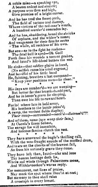 It’s difficult to imagine that the lands around Citrus County were once a battleground. You may be familiar with the siege of Fort Cooper since it’s commemorated by an annual reenactment of that event. You may not be aware that another brave soldier met his fate during the Seminole Wars after volunteering to find a way across the Withlacoochee River to advance his regiment. This is the story of James Farley Izard who fell in our area during the Second Seminole War in 1836.