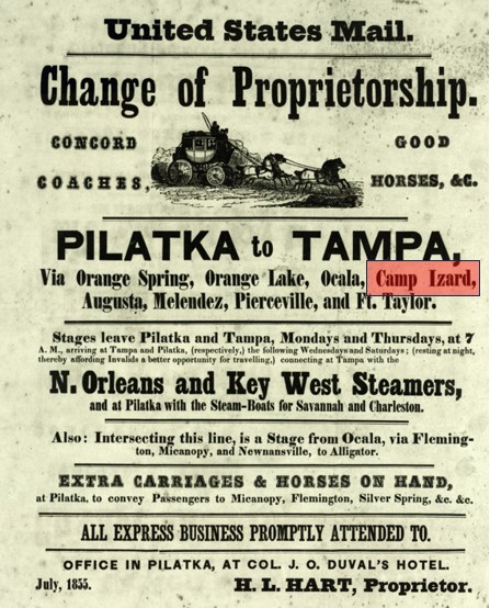 While the fort was eventually abandoned by the military, the area around the old encampment continued to be called “Camp Izard” by the settlers who migrated there. Citrus County pioneers such as E. Croft and W.C. Zimmerman were listed as residents of Camp Izard. “Uncle Alf” Tompkins was a Constable for Camp Izard before there was a “Tompkinsville” – the forerunner of Inverness. It was a stop on the stagecoach between Tampa and Pilatka.