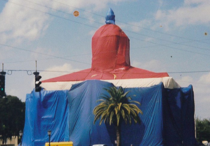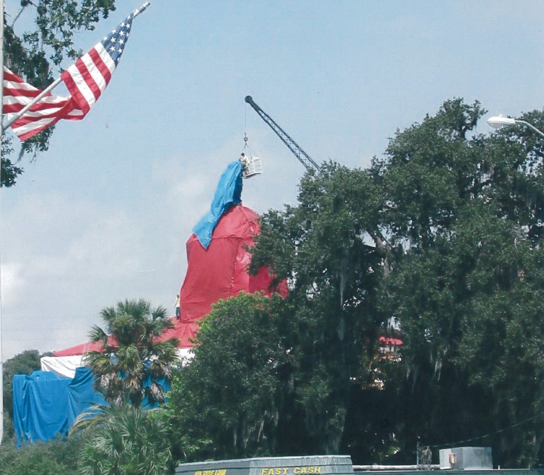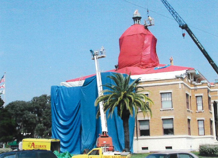 Citrus County engaged a local company – Accurate Pest Management – to handle this mammoth task. In the post-9/11 environment, company owner Ed Williams wanted to complete the job but also rally residents in a show of patriotism. Williams purchased red, white and blue canvas sheets and mobilized his staff to envelope the Museum so that it would reflect the national mood. Heavy-duty cranes arrived on the scene in September 2004 and his men mounted the stairwells up to the very top of the cupola. Perched outside the windows, they guided the red canvas across the roof. Once the blue layer topped the building, the Museum was ready for effective treatment.