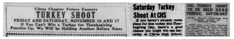 Turkey Shoots were commonly held during the Thanksgiving season as a fund-raising event for local organizations. For readers not familiar with these events, participants would use shotguns or rifles to shoot at targets at city parks and fields. The person who shot closest to the bullseye won a turkey. Hunting for live turkeys was a popular pastime as well and provided the main course for many Citrus County households.