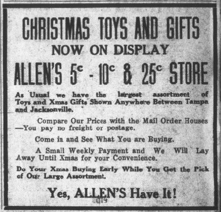 “Pop” Allen’s five and dime expanded to become a veritable Christmas wonderland after Thanksgiving. His store became the Citrus County destination for children hoping that Santa would bring them gifts and treats – but only if they were on Santa’s “Nice List”.