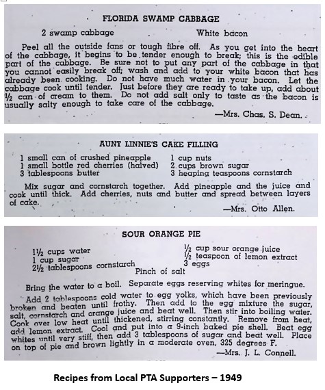 Some residents remember a different Thanksgiving holiday. For those working on small subsistence farms, Thanksgiving was more or less just another day. Their meal would consist of swamp cabbage flavored with fatback (a.k.a. salt pork). They would start the day’s tasks and take a break at mid-day. Their cabbage would be ready in a couple of old pots and then they would go back to work. Since Thanksgiving took place during fruit picking season and everyone would go back to harvesting fruit after their dinner.