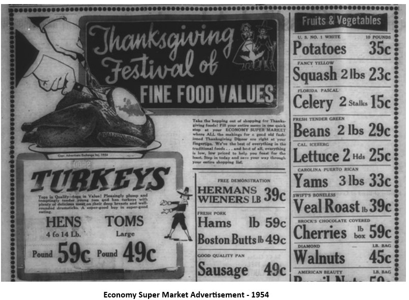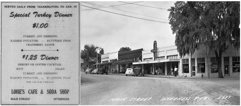 Restaurants had offered Thanksgiving meals prior to the War, but given the economic conditions and rationing requirements, people decided that it was easier to dine at home. After the War, however, many of the canned foodstuffs that were reserved for military staff were now available for civilian purposes. Expanded restaurants , such as the Louie’s Café in downtown Inverness, began to offer all-inclusive Thanksgiving meals at an attractive price. More supermarkets opened in the area and their advertisements reflected expanded post-war supply and lower prices.