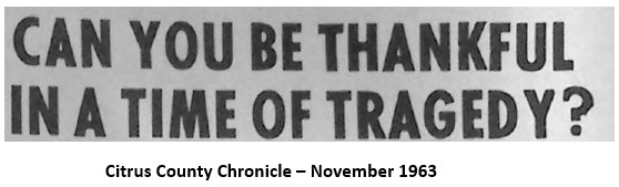 On November 22, 1963 President Kennedy was assassinated a few days before Thanksgiving. The country was in a somber mood and people wondered how they could possibly be thankful in light of the tragedy. The all-faith union services became a source of solace and comfort that year. Rev. Tom Price gave a sermon at Union Thanksgiving service in Crystal River that year. He told the congregation “There’s no place in our American heritage, just as there’s no place in the Christian faith, for that extreme, blind fanaticism which thinks it has the right to silence those with whom it disagrees…I believe that history will record Friday, November 22 as the turning point of American extremism, as the time when the American people began to consider the stewardship of blessing with a new maturity.”