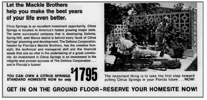 The Mackles turned their attention to Volusia County and developed the Deltona community in 1962. They saw great opportunity in Florida’s West Coast and opened Marco Island in 1964. They developed a “planned community” model that they would apply repeatedly throughout Florida. In 1966, they decided to expand into Citrus County. They stood ready to purchase about 12,000 acres in Lecanto – about 3 miles East of Crystal River and 6 miles West of Hernando. Negotiations were on the final stages of being concluded when an unexpected complication brought those plans to a halt.
