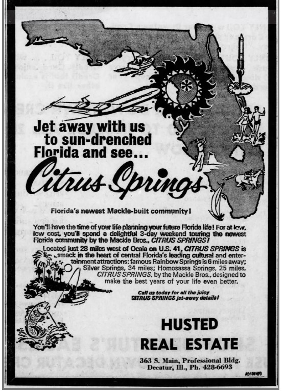 The Mackle Brothers chartered airplanes to bring buyers from across the North. They estimated that during the month of January, 70,000 people were flown from the frozen cities of Chicago, Grand Rapids, Detroit, Pittsburgh, Columbus, Boston, and Philadelphia to Citrus Springs. They were met by “Moose” Skowron and his staff at the Ocala airport and loaded onto buses for the short trip to Citrus County. Meals were provided and side trips to Weeki Wachee and local beaches were scheduled. Special tours of the area and model homes were featured. In the end, thousands of happy travelers, dreaming of escaping the freezing cold temperatures purchased lots in the new community.