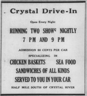The Crystal Drive-In was the first outdoor theater in the county. It was owned by Walter Bunts and was part of his gas station/cafe business. He didn’t advertise which movies would be showing each night so we know very little about his establishment other than it was located a half-mile South of Crystal River. It was not listed in the national Motion Picture Almanac so this Drive-In was a sidelight business.