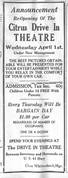 Less than a year later, the projection screen was the victim of a windstorm and the Citrus Drive-In had to close for repairs. It didn’t reopen until April 1953 under the leadership of a new manager, Clem Whittenbeck. He instituted a revised pricing policy that dropped the admission fee to forty cents per person every night – except the Thursday special of one dollar per carload.