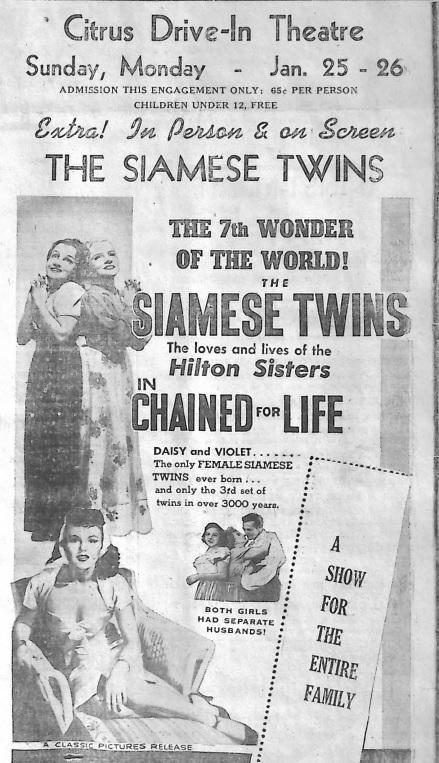 When a movie was released about the lives of Daisy and Violet Hilton – two conjoined sisters – the Citrus Drive-In featured a special engagement with the stars on screen and live on the stage of the Hernando theater. The event was billed as “a show for the entire family”.