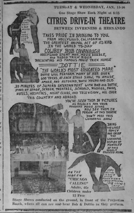 Another live show featured fancy riding cowboy Bob Cavanaugh and his trick horse Dottie, billed as “the worlds most educated mare”. Cavanaugh and Dottie had served as stunt doubles in some recent Western movies and were riding the circuit to take advantage of their fame. They performed trick riding routines in front of the projection screen.