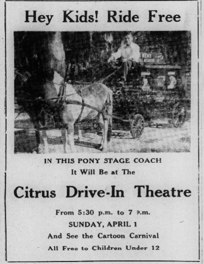 What child could resist a ride on a pony stagecoach before the night’s movie presentations? Like many other Drive-In’s, the Citrus theatre offered rides on stage coaches and other vehicles. Kids would board the stage and then disappear as they rode around the park. Attractions such as this made a trip to the movies a special treat for children – who would beg their parents to see the next show.