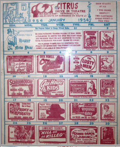 The owners of the Citrus managed to provide a full roster of offerings that was rotated frequently so people would always be a guaranteed a new movie every few days. A sample of their January 1954 schedule for the month lists a wide variety of movies for differing tastes. A viewer could see Westerns, Square Dancing, Crime Mysteries and more during the month.