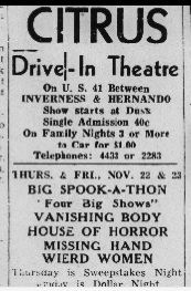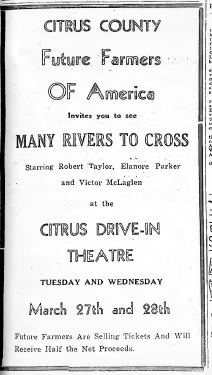 The Citrus Drive-In became more than a movie venue. For example, the Inverness Independence Day celebration was held at the theatre. The Inverness Jaycees sponsored a display of historic documents replicas and a special showing of a patriotic movie titled “Down Freedom Way” . The Hernando Lions Club sold barbecue dinners during the afternoon (only $1 per plate for adults).