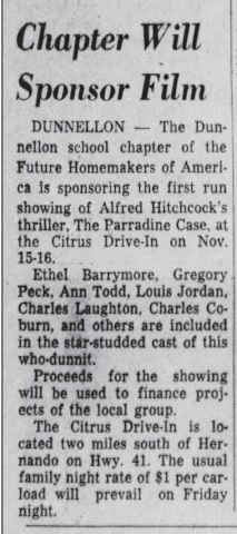 Benefit performances for local organizations were frequently held. Groups such as the Future Farmers of America (FFA) and the Future Homemakers Club of Dunnellon sold tickets and were given a portion of the proceeds for that night’s performance.