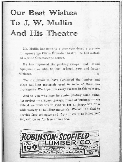 The management of the Citrus Drive-In changed over the years. J.W. Mullen bought the theatre in 1955 and made a number of improvements to the facility, such as installation of a expanded screen that could handle the latest Cinemascope format.