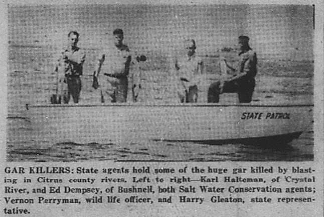 The number of gar dropped dramatically that year. Encouraged by the preliminary results, an expanded group returned to the rivers in May, 1955. Headed by the State Wildlife officers, another 500 sticks of dynamite were used to kill approximately 10,000 more gar during their spawning season. Local Conservation Officer Marion Oliver from Crystal River was part of the State team. Local volunteers were John Brown (Ozello), Knox Purcell (Crystal River) and Duncan MacRae, Sr. (Homosassa). Raymond Hart (Crystal River) was in charge of the explosives.