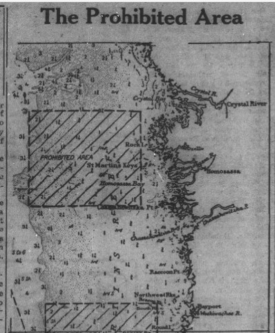 By 1955, Citrus fishermen had grown weary of the restrictions imposed by the Air Force. They contacted the Florida Congressional delegation to complain about the damage being done to the fishing industry by the continued use of the bombing range. Local leaders told our federal lawmakers that “…the Homosassa River channel is completely cut off by the target range in the prohibited area. In fact, two of the channel markers and one marker buoy are within the prohibited area. This means that no one can go from Homosassa or Homosassa Springs without violating the ‘no trespass’ orders of the Air Force”