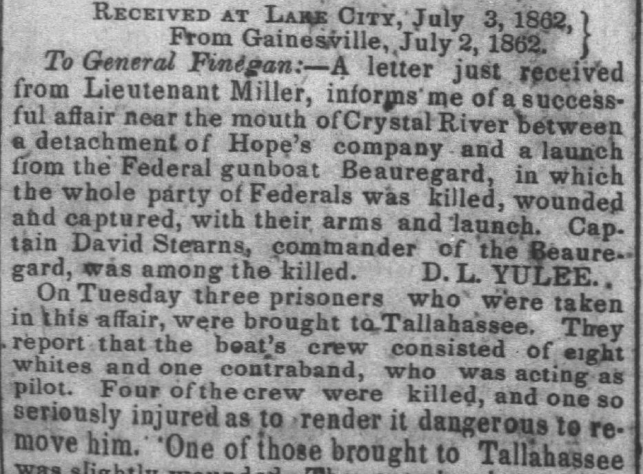There are at least two legends about the name “Fort Island” and both of those stories tie the area to the Civil War. One of the tales was widely reported in newspapers on both sides of the conflict. The Union ship Beauregard was stationed off the coast of Crystal River. Her crew was assigned the task of intercepting blockade runners in June 1862. The mouth of Crystal River was narrow and the shoreline was close to the channel, which meant that the deep draft Union ship could not approach the town. The crew of a Confederate sloop pretended to be in distress in shallow water. The Master of the Beauregard dispatched a small contingent in a rowboat to capture the Rebel ship. He was unaware that Confederate soldiers laid in wait on the shores of Shell Island and the site of today’s Fort Island. Four Union troops were killed in the blistering fire that opened from the land-based forces. Reports of the successful ambush were carried throughout the South while Union newspapers first attributed the casualties to a lightning strike.