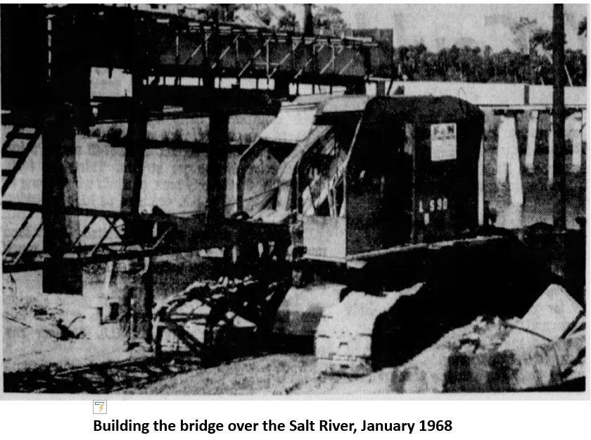 The first step was building a road through the marshy land. The Brown and Root Construction company was awarded a $561,000 contract to complete the roadway. They expected to use 305,000 yards of fill to raise the roadbed above the swamp. A bridge over the Salt River had to be built. Since they were digging fill from the surrounding marshland, it would sometimes take three weeks for the soil to dry out before it could be used to build the road. As is the case with many construction projects, the road project was completed in 1968 with an overrun of almost $100,000.
