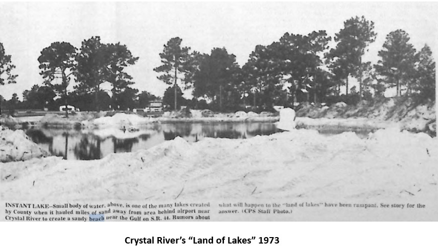 Dredging sand for the beach was a major component of the first phase. The Army Corps of Engineers thought that not enough sand would be available at the site to fill the beach. As it turned out they were correct. In addition to one of the dredging boats catching fire, the operation encountered more difficulties. When the dredging contractor reported they has exhausted the available sand, the Citrus County Roads Dept had to unexpectedly jump into action. To meet July 1973 project deadlines, they had to scoop and haul sand from various locations in western Citrus County. They completed their assignment, but it took 16 days of round-the-clock shifts to haul move the required beach sand. Their excavation left holes in the Crystal River area that filled with water and was jokingly called “The Land of Lakes” by locals.