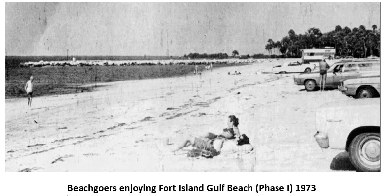 The Phase I version of the Fort Island Gulf Beach was opened in July, 1973. This meant that the beach was open but there were no amenities except for some portable sanitary facilities. In spite of the spartan conditions, the news traveled about the new beach. Local citizens and visitors alike flocked to the only Gulf beach in the county. In the absence of a parking lot, Fort Island resembled the famous Daytona Beach with automobiles parked near the beachgoers.