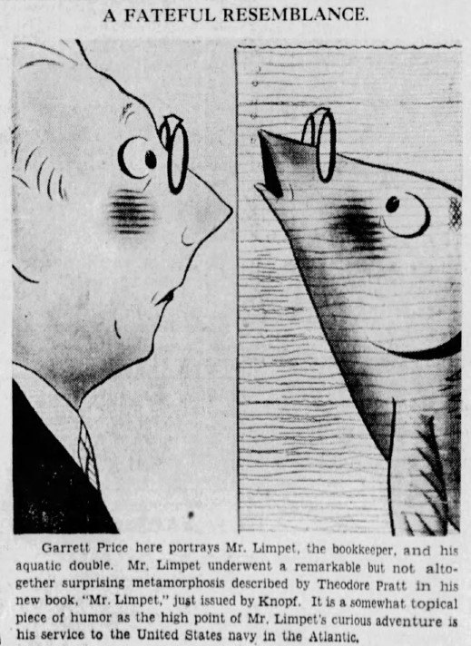In his book, Mr. Limpet was a shy, bookish clerk living in Brooklyn. Limpet is fascinated with fish and spends hours reading about them. One day, he falls into the water while watching fish from a pier and is inexplicably turned into one of them. His only resemblance to his past human life were the spectacles that he continued to wear. He is able to communicate with the other fish and warns them away when a fisherman’s hook is nearby.