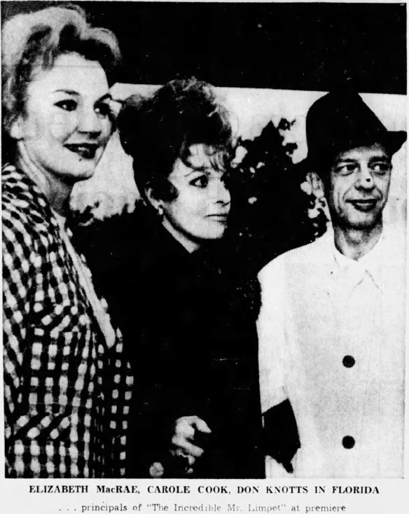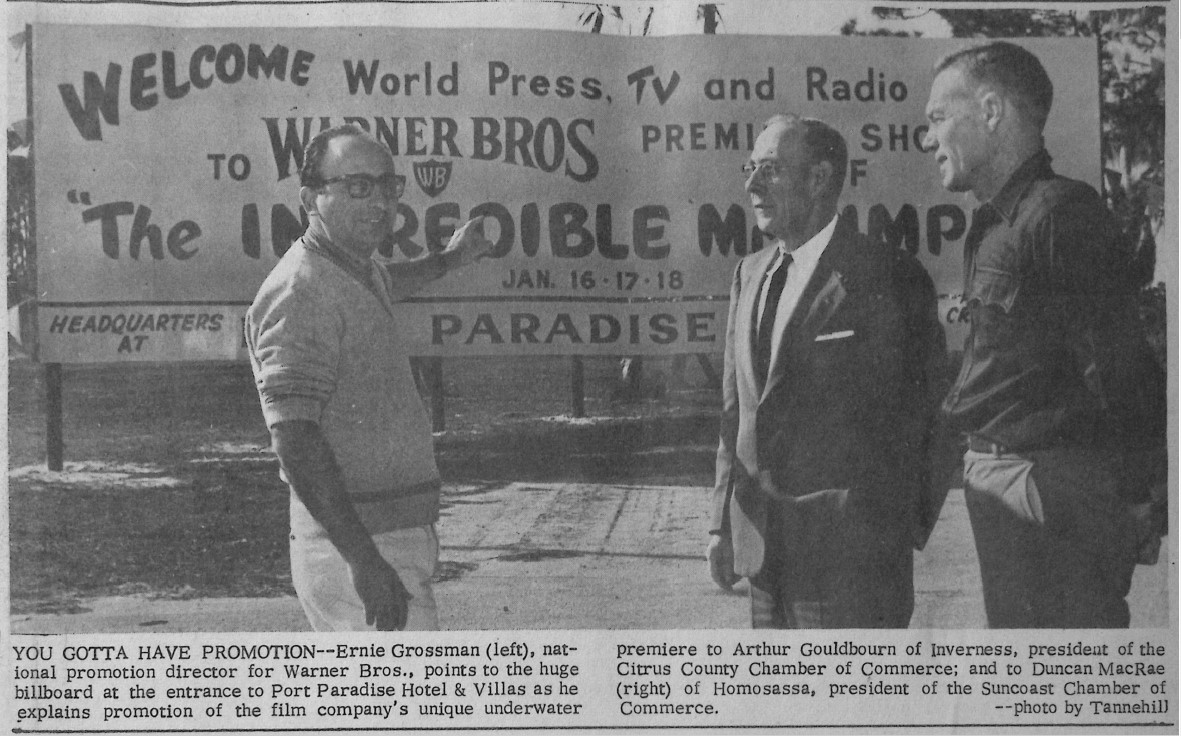 All of the attendees reported that they had a good time in our area and returned to write favorable reports about the movie and the hospitality of the people in Citrus County. One write opined: “The fantasy is so convincing, I might add, that on an all-day deep sea fishing expedition the next day, it was hard to dispel the thought that “Mr. Limpet” might not pop out of the water at any moment – glasses and all”