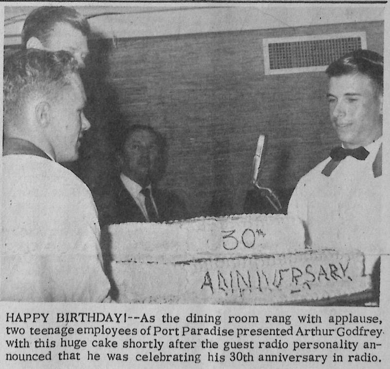 Arthur Godfrey celebrated his 30th anniversary as a radio host. The staff at Paradise Point brought a cake in recognition of this milestone.