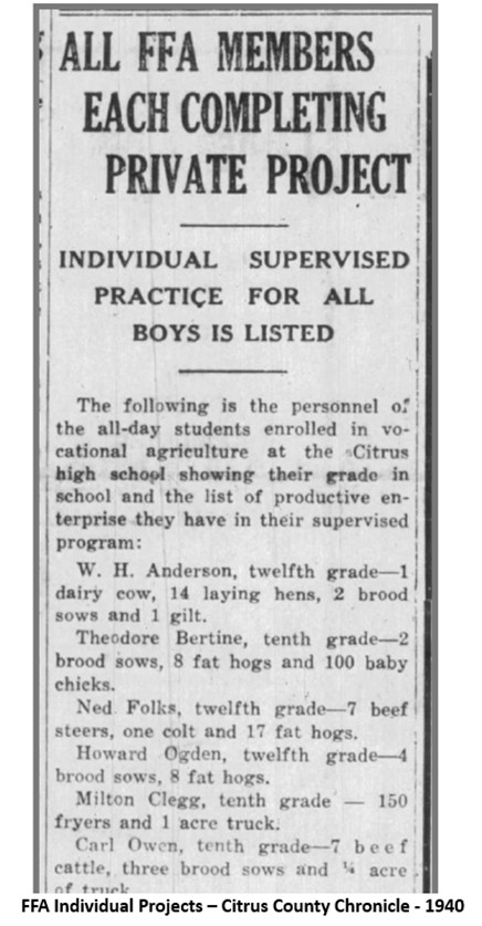 By the 1930’s there were two local FFA chapters existing in the High Schools of Citrus County.