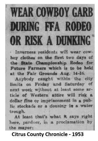 The Mayor of Inverness, Donald Bradshaw, issued a proclamation that all residents had to wear at least one item of Western wear during the week of the FFA Rodeo or be subjected to “jail” or “public dunking”. Offenders could commute their sentence through a generous donation to the FFA’s fund.