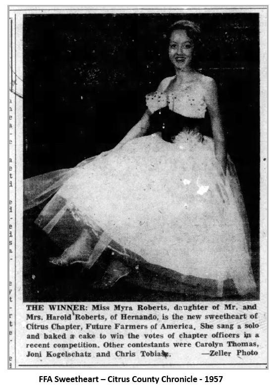 While the focus of the FFA was agriculture, activities aimed at personal development and physical education were also offered to members. You may be surprised to learn that Public Speaking was one of the events where Citrus County boys excelled. Perhaps inheriting some of his father’s legendary oratorical skills, “Butch” Williams won a number of speaking awards. (He was the son of Francis “Cowboy” Williams, who was sought across the State as a popular Anti-Communist speaker).