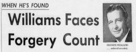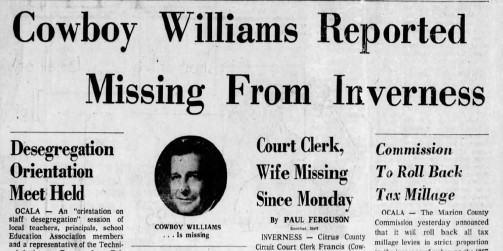 The reason for Cowboy’s absence soon became apparent. He was being charged with multiple counts of forgery and a warrant was issued for his arrest. The FBI was called upon to help find the fugitive clerk. Governor Kirk removed Williams as Clerk of Court on June 20 and replaced him with a St. Petersburg man.