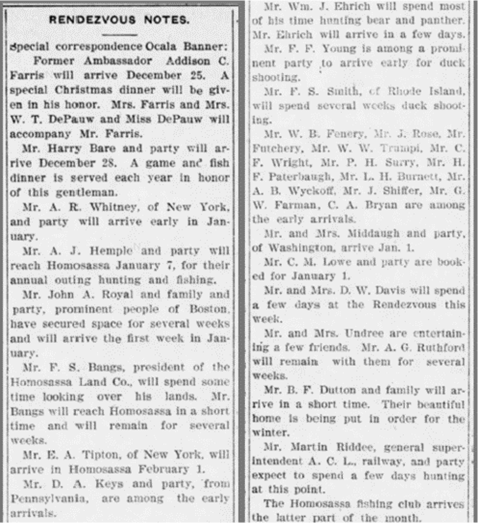 President Cleveland’s name has been associated with the Rendezvous lodge. That resort was the subject of frequent updates and columns in the local newspaper. The student of history can conclude that it was impossible to escape the notice of the local newspapers – especially if the visitor was the President of the United States. Click through the images below to see some typical articles regarding guests and accommodations at the Rendezvous in Homosassa in 1906: